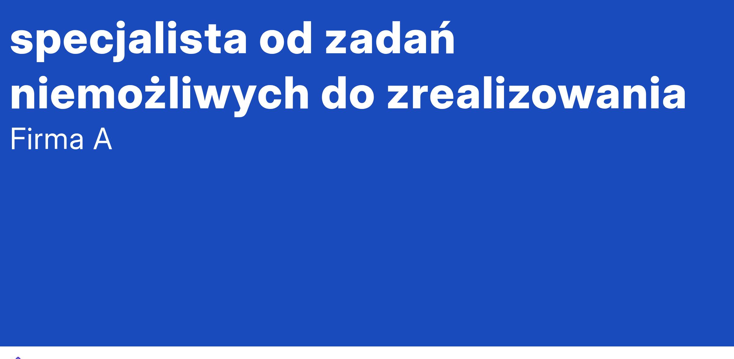 Firma A poszukuje doświadczonego specjalisty od zadań niemożliwych do zrealizowania, który dołączy do naszego zespołu HR. Praca jest zdalna, z możliwością pracy w lokalizacjach: 27-620 Dwikozy lub 33-100 Tarnów. Idealny kandydat będzie odpowiedzialny za rozwiązywanie skomplikowanych problemów oraz wdrażanie innowacyjnych rozwiązań w obszarze zarządzania zasobami ludzkimi.